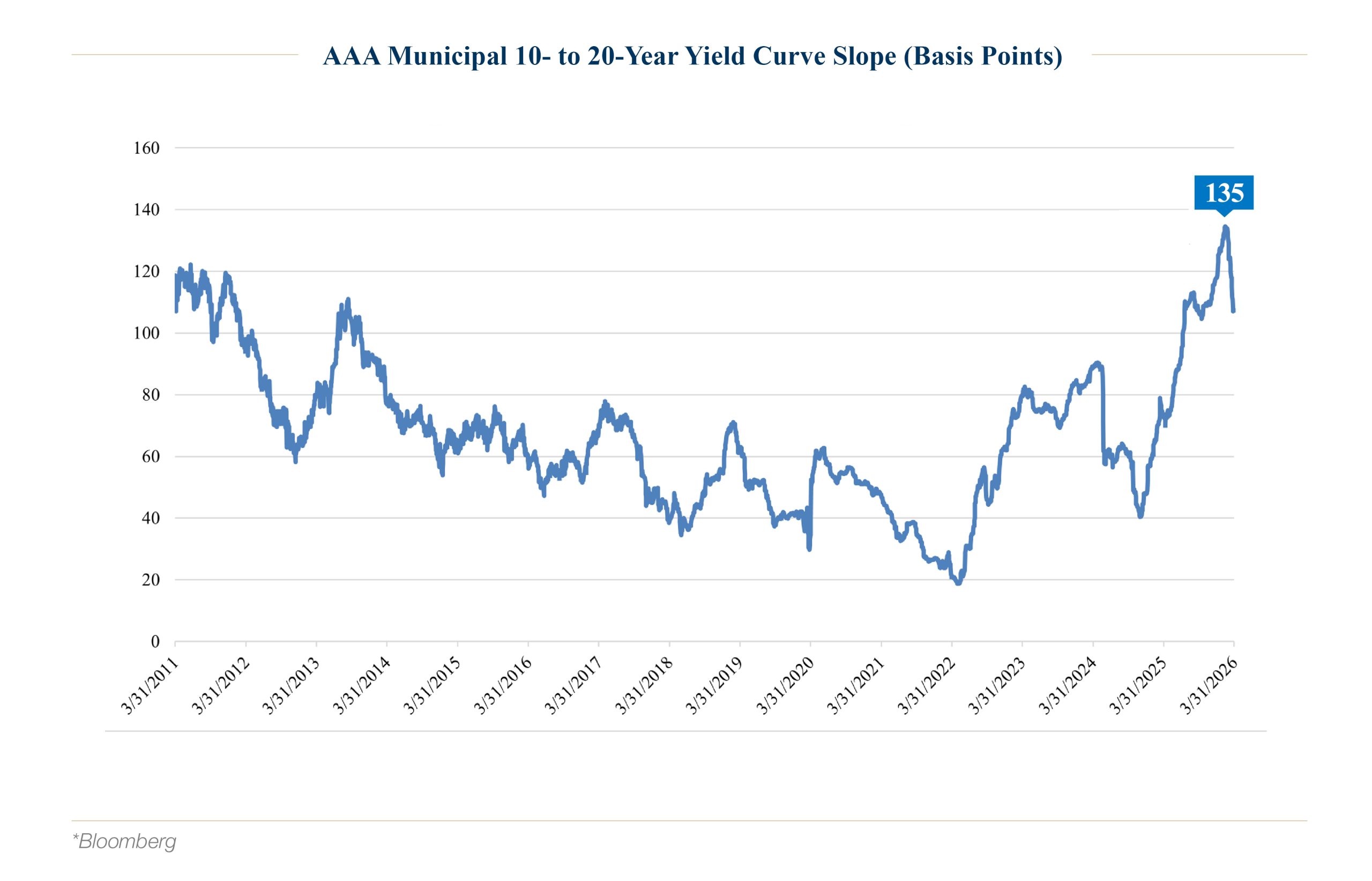 As shown in the chart below, 135 basis points is the steepest level of the 10- to 20-year municipal curve over the last 15 years. Only during rare events, such as the 2008 Financial Crisis and the 2010 60 Minutes interviewxi, when an analyst incorrectly predicted widespread municipal defaults, did the slope reach these levels.