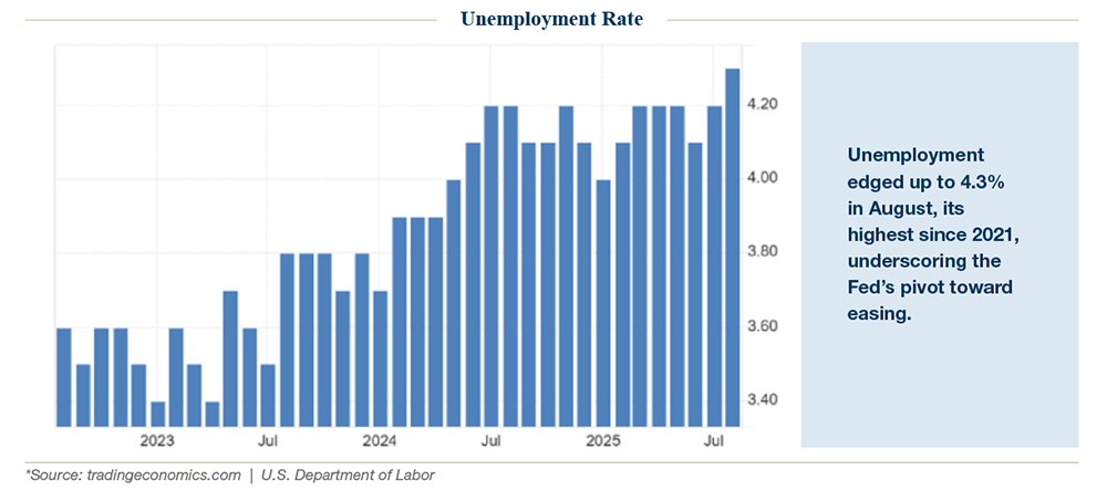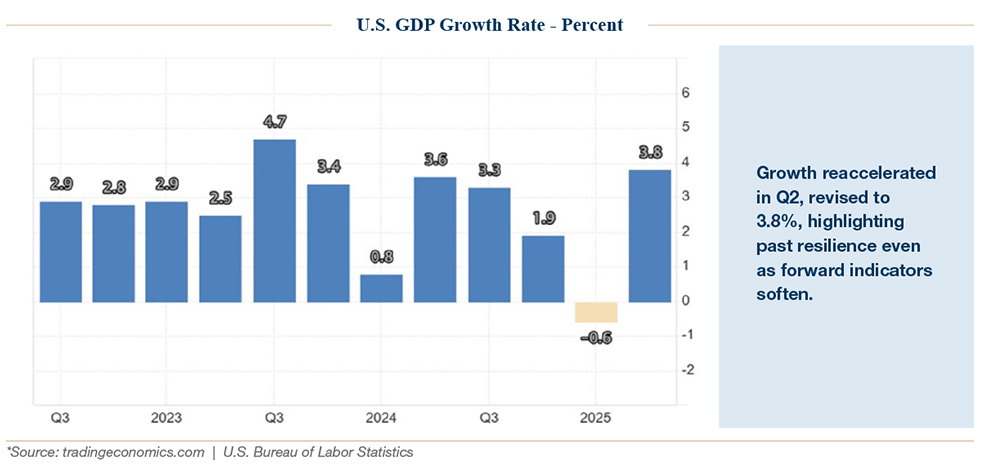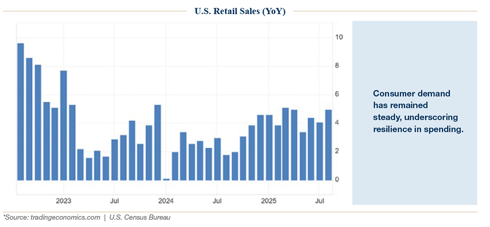 At the core of investor optimism was steady growth. GDP for Q2 was revised up to 3.8%, the fastest pace since 2023, and Q3 tracking estimates from the Atlanta Fed pointed to 3.9% annualized growth. Consumer spending, particularly in services, held firm. Durable goods orders rebounded in August, and retail sales remained solid.