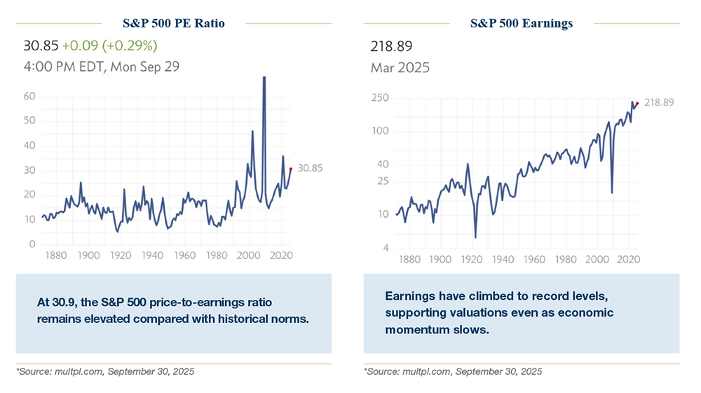 The persistence of these gains highlights both resilience and risk. Investors have continued to lean on strong corporate earnings, optimism around artificial intelligence, and the start of a new Fed easing cycle. At the same time, valuations have stretched further, and the cushion for disappointment is thinner.