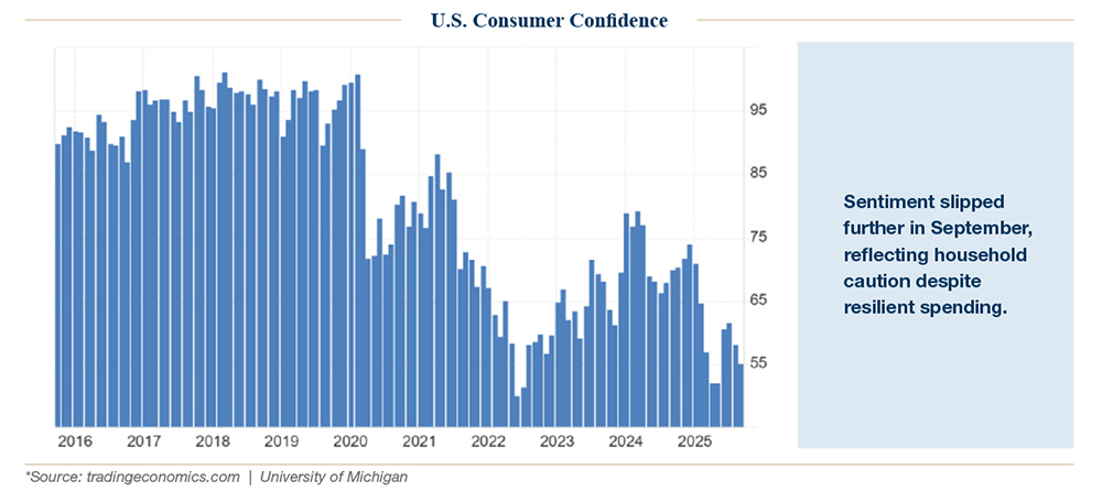 As Q4 begins, markets face a delicate balance. Growth has held up, inflation has eased enough for rate cuts, and earnings remain strong. Yet consumer confidence is weak, labor is showing cracks, and valuations are stretched. Markets have absorbed all of this and continued higher, but the margin for error is shrinking.