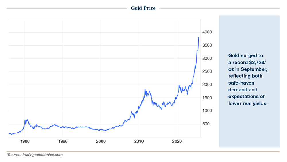 Fiat currencies in general have taken a backseat to the original monetary metal. In U.S. Dollar terms, gold gained nearly 17% in Q3 and over 47% year-to-date, surging past $3,700 per ounce. Bitcoin rose more modestly, up 6.5% in Q3 and 22% YTD. This divergence highlighted investors’ preference for gold as a hedge against policy and political uncertainty, while crypto assets played a more minor role in portfolio hedging compared to past cycles.