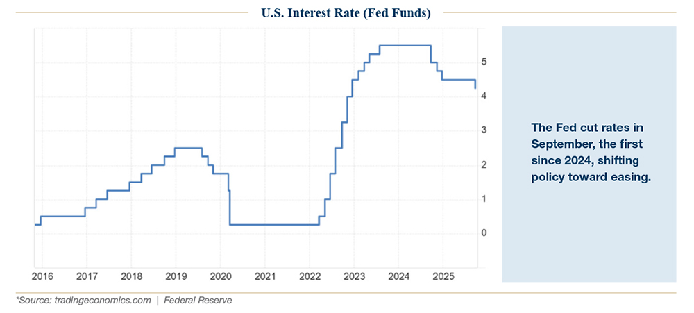 - The Fed began an easing cycle, cutting rates for the first time since 2024 and signaling further reductions.