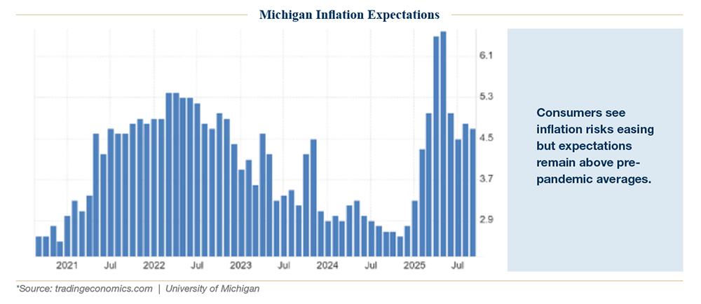 Inflation remained sticky but manageable. Core PCE held at 2.9% year-over-year, while CPI rose 0.4% in August, lifting the annual rate to 2.9%. Inflation expectations, as measured by the University of Michigan survey, stayed elevated, with one-year expectations at 4.7%.