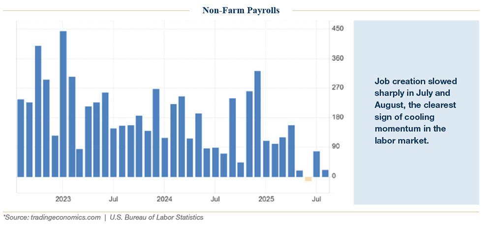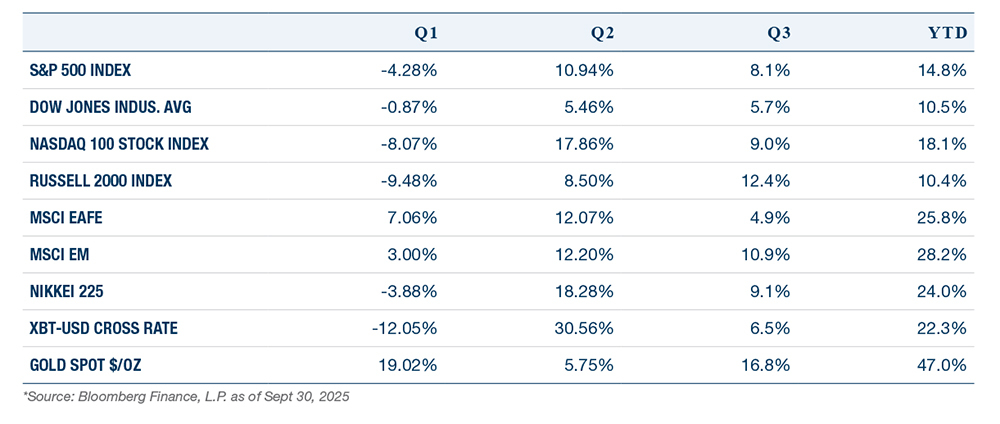 The third quarter of 2025 reminded investors of an old adage: “bull markets climb a wall of worry.” Each week seemed to deliver a headline that could have derailed confidence. Tariffs escalated, the Federal Reserve faced increased political scrutiny, consumer confidence eroded, and the labor market began to show its first cracks in years. Yet, through it all, markets continued to grind higher. The S&P 500, Nasdaq, and Russell 2000 delivered strong quarterly gains, gold surged to record highs, and global equities participated broadly in the rally.