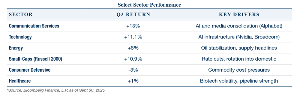 Sector leadership was decisive. Technology and communication services once again led, both up double digits in Q3, as AI infrastructure and digital platforms dominated investment flows. Energy rebounded, rising 8%, supported by the stabilization of oil prices. Consumer defensives lagged, losing about 3%, while healthcare delivered only marginal gains. Rate-sensitive sectors such as utilities and real estate benefited from falling yields.